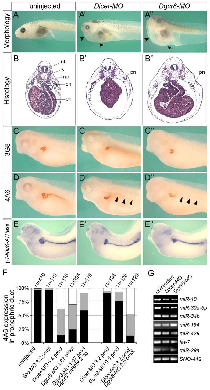 Fig. 1. Inhibition of miRNA biogenesis results in pronephric abnormalities. (A-Eâ²) Xenopus embryos were injected with 6.4 pmol Dicer-MO or 1.07 pmol Dgcr8-MO and compared with uninjected sibling embryos by morphology at stage 43 (A-Aâ²), histology with Hematoxylin and Eosin at stage 42 (B-Bâ²), immunostaining with 3G8 and 4A6 at stage 40 (C-Dâ²), and by whole-mount in situ hybridization for β1-Na/K-ATPase at stage 39 (E-Eâ²). Arrowheads indicate edema formation (Aâ²,Aâ²) and the loss of 4A6 staining in duct (Dâ²,Dâ²). en, endoderm; no, notochord; nt, neural tube; pn, pronephros; s, somites. (F) Quantification of 4A6 staining in the pronephric duct, comparing uninjected control embryos with embryos injected with a standard control MO (Std-MO), Dicer-MO, Dgcr8-MO, a combination of Dicer-MO and Dgcr8-MO, or Dgcr8-MO together with Dgcr8* mRNA at stage 40. The graph represents the summary of at least three independent experiments. The number (N) of embryos analyzed is indicated above the bars. Black, normal expression; gray, partial expression; white, no expression. (G) RT-PCR analysis of multiple miRNAs after Dicer and Dgcr8 knockdown at stage 35. SNO-412 served as loading control. |