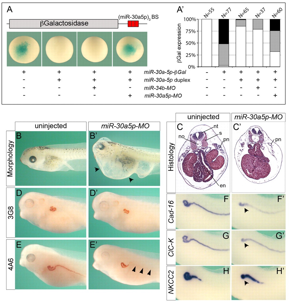 Fig. 4. miR-30a-5p knockdown and global inhibition of miRNA biogenesis have very similar kidney phenotypes. (A) To determine the specificity of miR-30a5p-MO, three consecutive miR-30a-5p binding sites (BS) were introduced in the 3â²UTR of a lacZ reporter. Xenopus embryos were injected with the reporter in the presence or absence of miR-30a-5p duplex and miR-30a5p-MO and processed for lacZ staining at gastrula stage. Injections with miR-34b-MO served as a specificity control. (Aâ²) Quantification of the lacZ staining in embryos: white, no staining; gray, partial staining; black, strong staining. The number of embryos analyzed in three different experiments is indicated above the bars. (B-Hâ²) Xenopus embryos injected with miR-30a5p-MO and uninjected controls were analyzed by morphology (B,Bâ²), histology (C,Câ²), immunohistochemistry with 3G8 and 4A6 (D-Eâ²), and whole-mount in situ hybridization for Cadherin-16 (Cad-16; F,Fâ²), ClC-K (G,Gâ²) and NKCC2 (H,Hâ²). Arrowheads indicate the presence of edema (Bâ²), loss of 4A6 staining in the pronephric duct (Eâ²), and the shortening of the tubule segments IT1, IT2 and DT1 (Fâ²,Gâ²,Hâ²). en, endoderm; no, notochord; nt, neural tube; pn, pronephros; s, somites. |