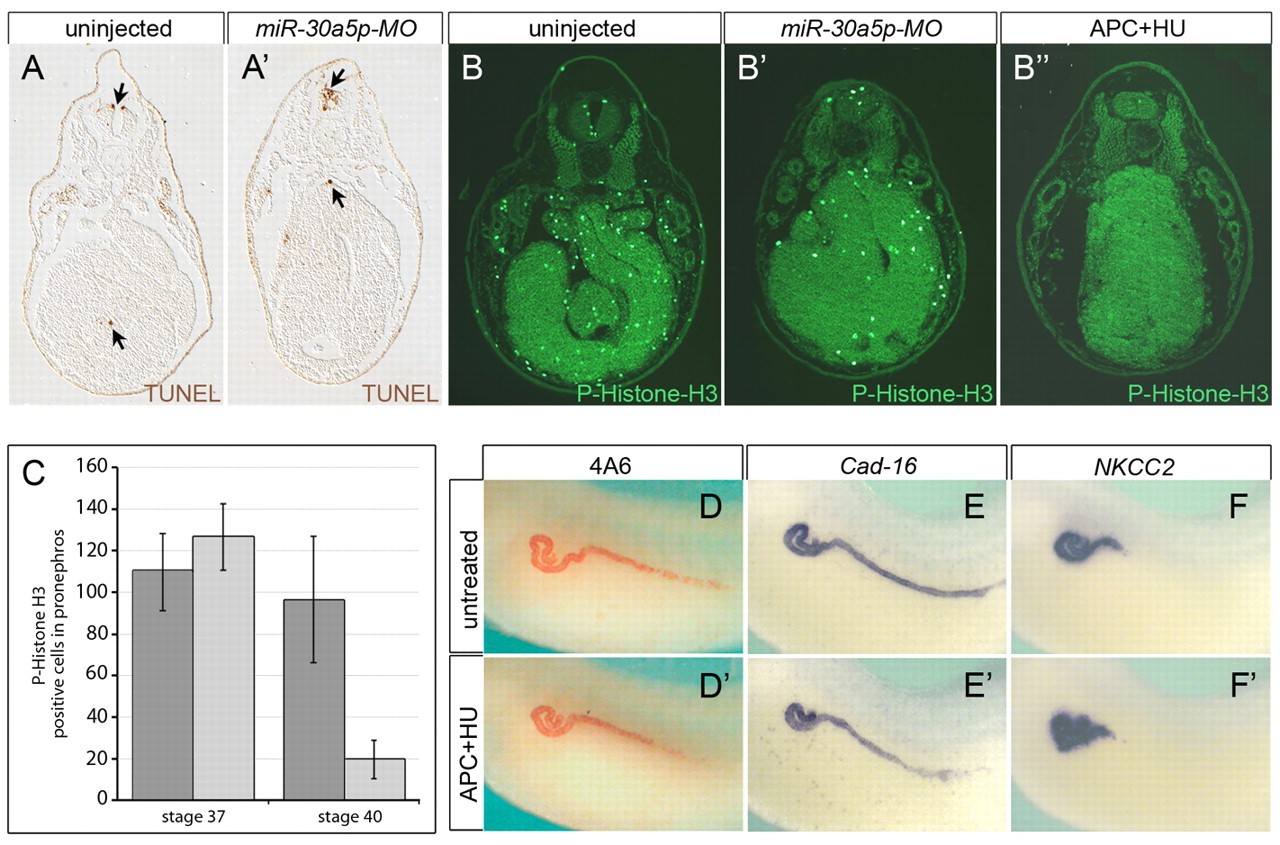 Fig. 5. Apoptosis and proliferation do not contribute to the kidney phenotype. (A,Aâ²) TUNEL staining of transverse sections from uninjected and miR-30a5p-MO-injected Xenopus embryos at stage 39. TUNEL-positive cells appear brown and are indicated by arrows. Note that no significant differences were observed by analyzing many serial sections of the pronephros. Several embryos and multiple independent experiments were analyzed. (B-Bâ²) Immunofluorescence analysis of proliferation with an anti-phospho-Histone H3 antibody comparing transverse sections of uninjected control embryos, embryos injected with miR-30a5p-MO and embryos treated with aphidicolin and hydroxyurea (APC+HU) at stage 40. (C) Quantification of phospho-Histone H3-positive cells in the pronephros of uninjected (dark gray) and miR-30a5p-MO-injected (light gray) embryos at stages 37 and 40. Consecutive sections covering the entire pronephric tubular area were counted. Numbers are the average of at least four different embryos from two independent experiments. Error bars represent s.d. (D-Fâ²) Immunostaining and in situ hybridization of untreated and APC+HU-treated embryos with 4A6 (D,Dâ²), Cadherin-16 (Cad-16; E,Eâ²) and NKCC2 (F,Fâ²). Note the absence of any patterning differences, even though proliferation was completely inhibited. |
