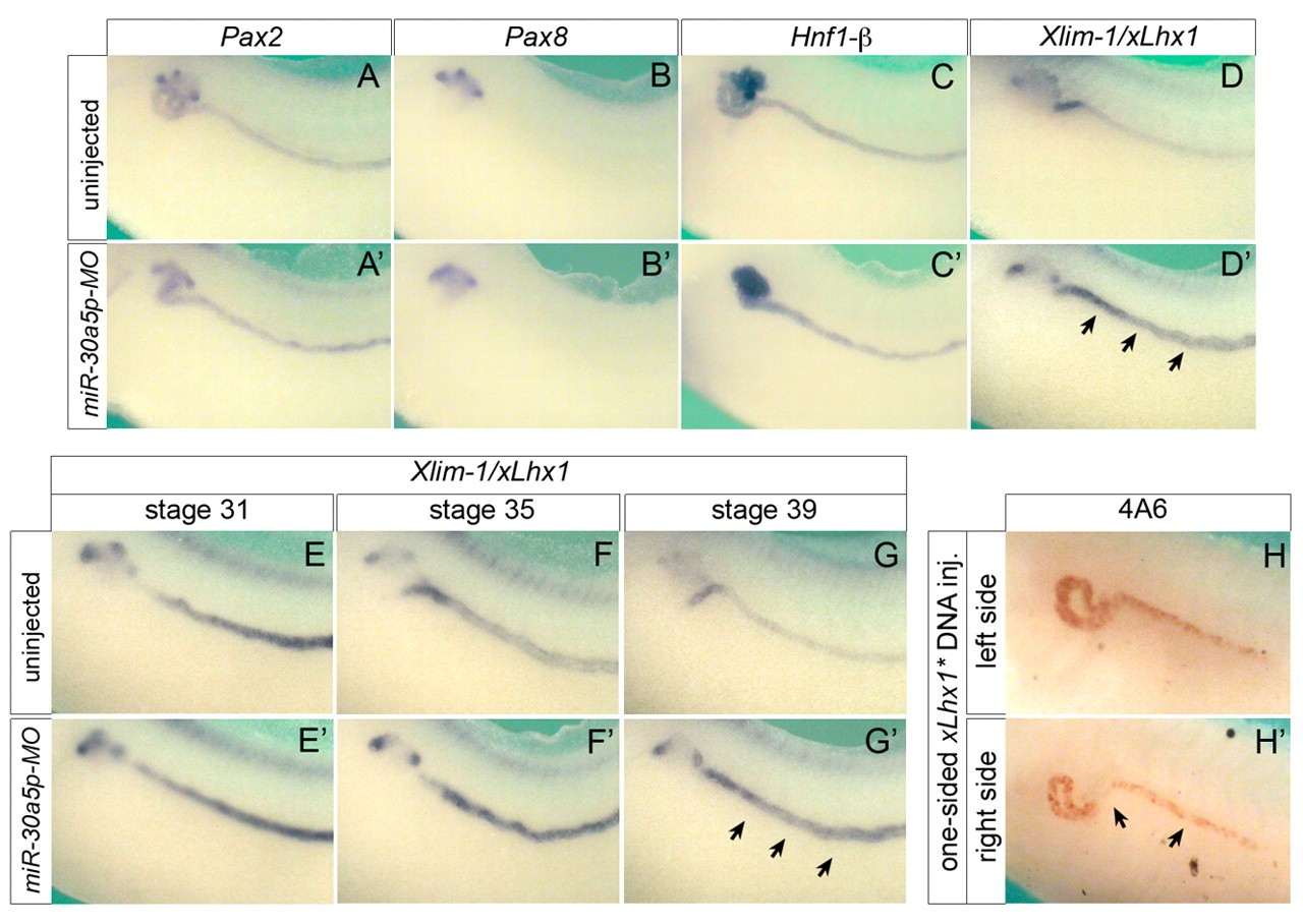 Fig. 6. Xlim1 is regulated by miR-30a-5p. (A-Dâ²) Whole-mount in situ hybridization for Pax2 (A,Aâ²), Pax8 (B,Bâ²), Hnf1-β (C,Câ²) and Xlim1 (D,Dâ²), comparing uninjected and miR-30a5p-MO-injected Xenopus embryos at stage 39. (E-Gâ²) Whole-mount in situ hybridization for Xlim1 mRNA of uninjected and miR-30a5p-MO-injected Xenopus embryos at stages 31, 35 and 39. Note that Xlim1 expression is maintained at a higher level in miR-30a5p-MO-injected embryos after stage 35, when endogenous expression of miR-30a-5p can first be detected (arrows in Dâ²,Gâ²). (H,Hâ²) Immunohistochemistry with 4A6 of stage 40 embryos injected with 4 pg pCS2-Lhx1* DNA into one blastomere at the 4-cell stage, comparing the left with the right side. Arrows indicate changes in 4A6 staining. Ectopic expression of Lhx1 mRNA transcribed from the pCS2-Lhx1* was confirmed by in situ hybridization (data not shown). |