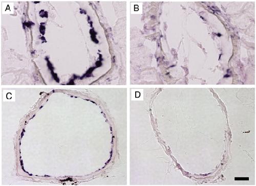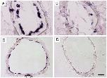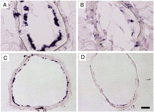 Fig. 2. The inhibition of fibroblast reprogramming. In situ hybridization with (A, C) collagen; (B, D) collagenase-3. (A, B) NF55 Col-TRDN transgenic tadpoles treated with 10 nM T3 for 4 days. (C, D) NF55 transgenic for ovine prolactin treated for 4 days with 10 nM T3. (scale bar = 40 μm). |