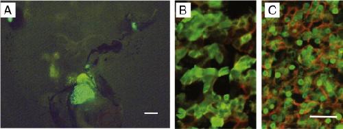 Fig. 5. The liver fatty acid binding protein (L-FABP) promoter from zebra fish expresses GFP specifically in the liver parenchymal cells. (A) Liver fluoresces in a low power ventral abdominal view of a NF55 tadpole transgenic for L-FABP-GFP; (B) section of the liver of the animal shown in (A) showing cytoplasmic expression of GFP in parenchymal cells. (C) Section of a NF55 liver of a tadpole transgenic for the tet inducible L-FABP-TRDN-GFP. This transgene is visualized in the nucleus. B and C are doubly stained with antibodies against E-cadherin (red) and GFP (green). Scale bar is 1 mm for A and 40 μm for B and C. |