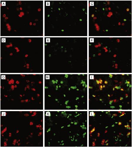 Fig. 8. Labelling of tadpole and adult red cells with BrdU at different times before and after TH treatment. (AâF) BrdU was injected 24 h before the addition of 10 nM T3. Three days later the livers were analyzed. (GâL) BrdU was injected after 48 h of 10 nM T3 treatment. The livers were isolated after another 24 h. (AâC and GâI) tadpole globin; (DâF and JâL) adult globin. (A, D, G, J) in situ hybridization (red). (B, E, H, K) BrdU immunocytology (green) of the adjacent sections; (C, F, I, L) merge of the adjacent two sections. Scale bar = 20 μm. |