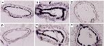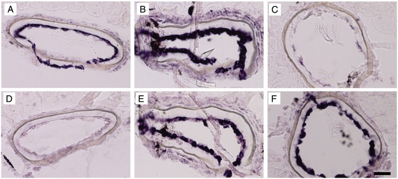 Fig. 4. Gene switching in liver parenchymal cells. In situ hybridization with (AâC) fetuin B; (DâF) serum albumin. (A, D) NF55; (B, E) NF60; (C, F) adult frog. Sections from the same stage are consecutive. Transition from larval to adult cell type happens at climax without significant cell replication or cell death. Scale bar = 100 μm. |