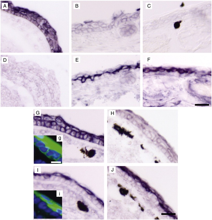 Fig. 3. Reprogramming of the skin in cross sections of the limb. In situ hybridization with A, B, C, G, H) tadpole keratin; D, E, F, I, J) adult keratin. Immunocytology with antibodies against (g) tadpole keratin; (i) adult keratin. Keratin is green and Dapi is blue. (A, D) NF55; (B, E) NF59; (C, F) adult frog; (G, g, I, i) NF55 treated with 10 nM T3 for 3 days; (H, J) NF55 treated with 10 nM T3 for 6 days. (g) Scale bar for g and i = 10 μm; for the in situ hybridization panels = 20 μm). |