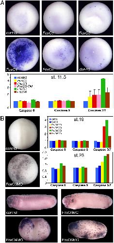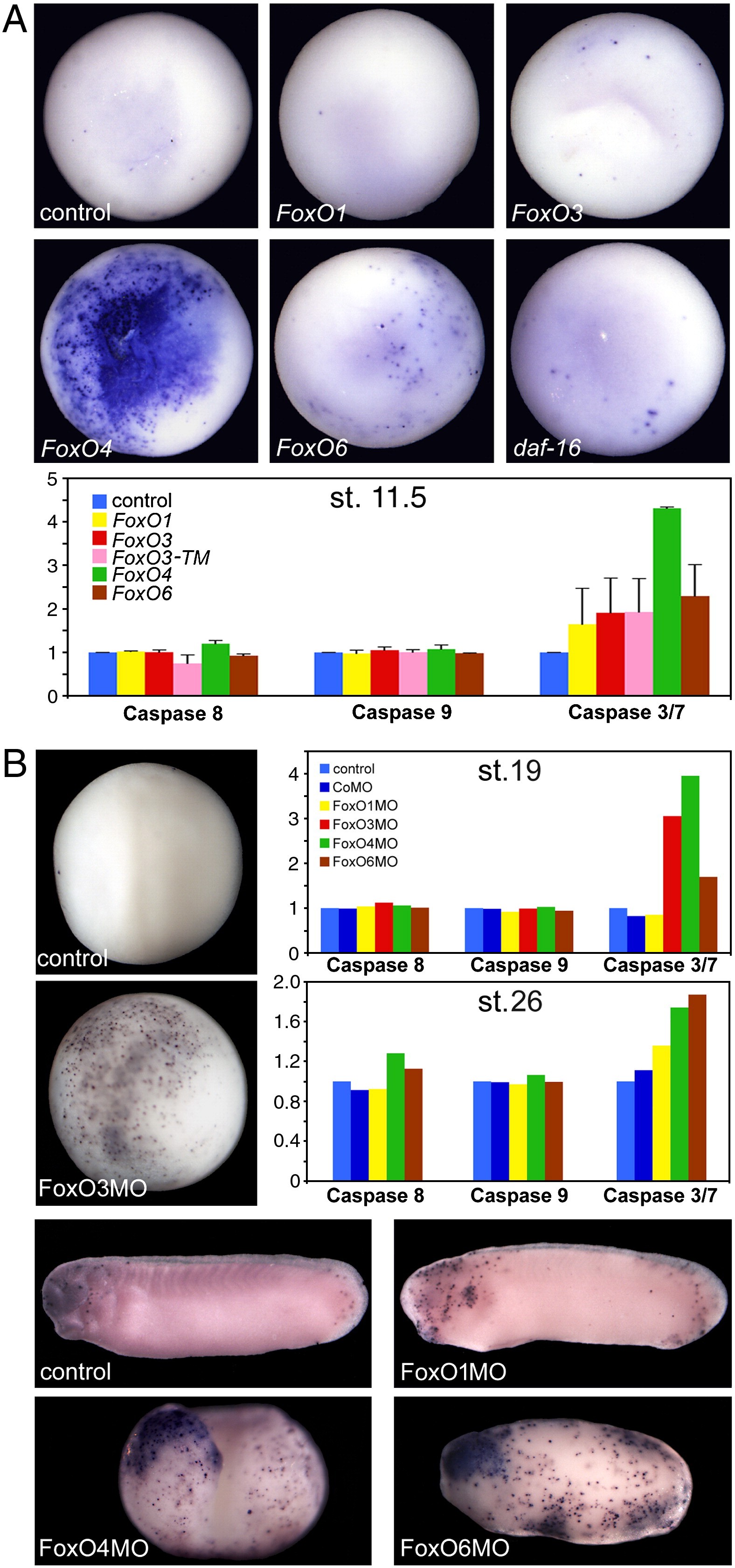 Fig. 8. FoxO proteins affect apoptosis. (A) Embryos were injected at 2-cell stage with the same amounts as given in Fig. 7. At stage 11.5, embryos were analyzed for apoptosis by TUNEL (animal view) and for caspase activities using caspase 8, 9 and 3/7 Glo assays. (B) Embryos injected with FoxO3MO and corresponding controls were analyzed by TUNEL at stage 15 (dorsal view, left), embryos injected with FoxO1MO, FoxO4MO or FoxO6MO were analyzed at stage 26 (lateral view, bottom). Caspase 8, 9 and 3/7 activities were determined at stages 19 and 26, respectively. |
