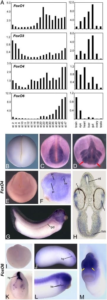 Fig. 2. Expression of FoxO genes. (A) Temporal expression patterns of FoxO1, FoxO3, FoxO4 and FoxO6 genes during Xenopus embryogenesis and relative expression in adult tissues. Amount of transcripts was analyzed by semi-quantitative RT-PCR using RNA isolated from embryos at indicated developmental stages (Nieuwkoop and Faber, 1967) or from adult tissues. Expression levels are shown in relative units. Histone H4 was used as internal control. (B-M) Spatial patterns analyzed by whole mount in situ hybridization of FoxO4 (B-H) and FoxO6 (I-M). (B) 2-cell stage, lateral view. (C) Stage 17, anterior view. (D) Stage 21, anterior view. (E) Stage 23 embryo hybridized with a FoxO4 sense probe, anterior view. (F) Magnification of the head of an embryo, stage 29. (G) Stage 35/36, lateral view. (H) Transversal section of the head, stage 38. (I) Stage 22, anterior view. (J) Stage 27, lateral view. (K) Magnification of the head at stage 28, anterior view. (L) Stage 32, lateral view. (M) Stage 30, anterior view. Red arrows indicate the eye field, yellow arrows indicate the olfactory pits. ba, branchial arches; hg, hatching gland; hm, head mesenchyme; l, lens; nt, neural tube; ov, otic vesicle; pd, pronephric duct; pl, presumptive lens; pr, presumptive retina; r, retina. |