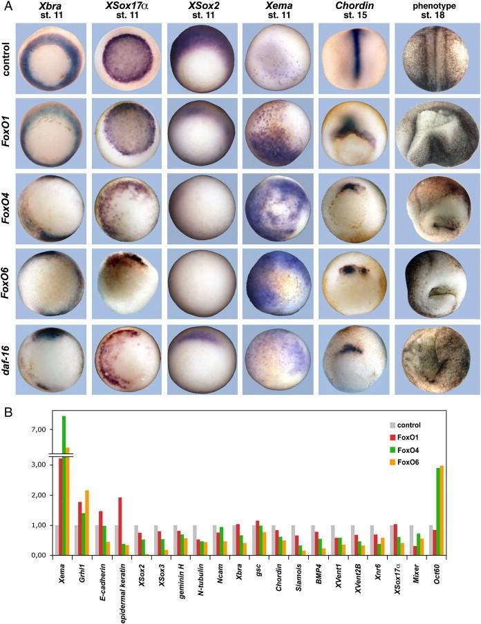 Fig. 3. Overexpression of FoxO1, FoxO4, FoxO6 and daf-16 interferes with early Xenopus development. (A) Whole mount in situ hybridization of uninjected control embryos and FoxO RNA injected embryos for Xbra, Sox17α, Sox2 at stage 11 (vegetal view), Xema, stage 11 (animal view), and Chordin at stage 15 (dorsal view). RNAs were bilaterally injected at 2-cell stage with 500 pg/blastomere (FoxO1), 400 pg/blastomere (FoxO4), 200 pg/blastomere (FoxO6) and 400 pg/blastomere (daf-16). The right column shows the phenotypes of unilaterally FoxO RNA injected embryos at stage 18, dorsal view. (B) Real time RT-PCR in gain of function embryos. Injected embryos were collected at stage 11.5. RT-PCR was performed for indicated genes. Percentages of phenotypes are given in supplementary Table S2. |