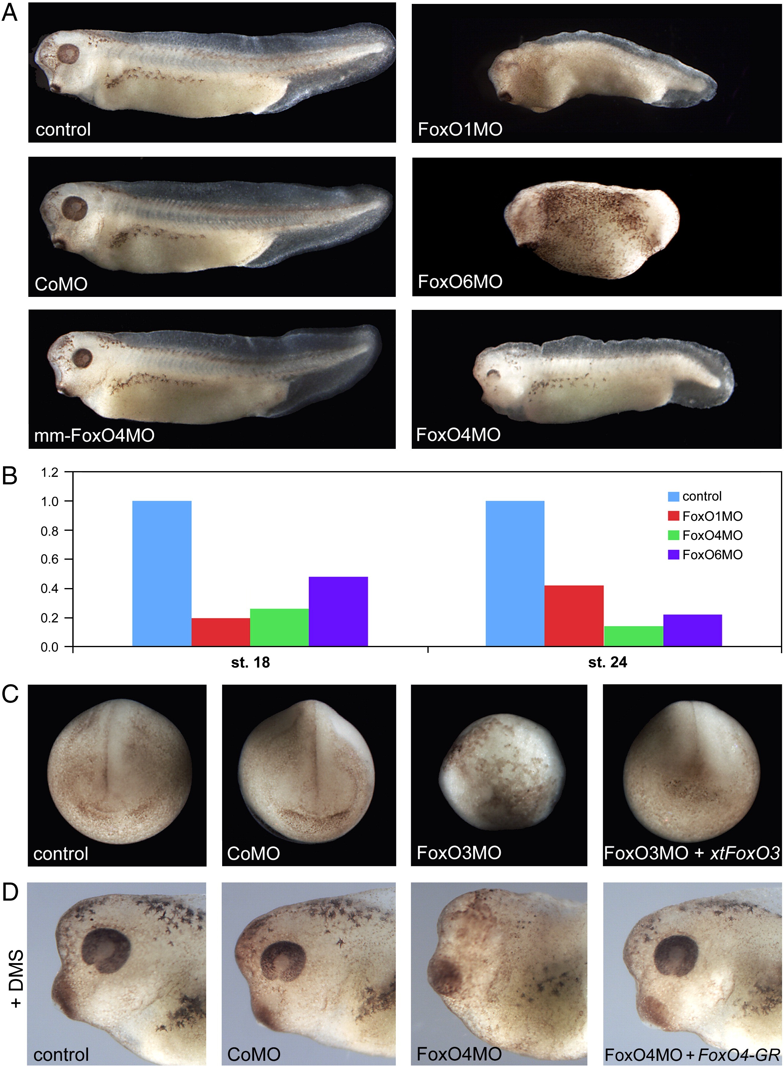 Fig. 5. Loss of FoxO function results in severe developmental defects. (A) Left column: Uninjected control embryo at stage 39, bilaterally CoMO injected embryo (50 ng/blastomere), mm-FoxO4MO injected embryo (40 ng/blastomere). Right column: FoxO1MO injected embryo (50 ng/blastomere), FoxO6MO injected embryo (30 ng/blastomere), FoxO4MO injected embryo (20 ng/blastomere). All embryos are shown by lateral view. (B) Real time RT-PCR for Sod-2 in wild type and FoxO depleted embryos at stages 18 and 24. FoxO1MO: 35 ng/blastomere, FoxO4MO: 15 ng/blastomere, FoxO6MO: 25 ng/blastomere. (C) FoxO3 depleted embryo and rescue (anterior view). Uninjected control embryo and bilaterally CoMO injected embryo (50 ng/blastomere) at stage 19. Injection of 20 ng FoxO3MO does not interfere with blastopore closure but leads to death during neurulation. Co-injection of 20 ng FoxO3MO together with 500 pg FoxO3 RNA of X. tropicalis can rescue to wild type. (D) Rescue of eye structures in FoxO4 depleted embryos. Magnification of the head at stage 35/36 (lateral view): uninjected control; CoMO injected embryo; FoxO4MO injected embryo, the eye is absent; rescue of the eye by co-injection of 160 pg mutated FoxO4-GR RNA. 15 ng CoMO or FoxO4MO were co-injected with fluorescein in one dorsal blastomere at 4-cell stage. Percentages of phenotypes are given in supplementary Table S4-S6. |