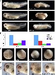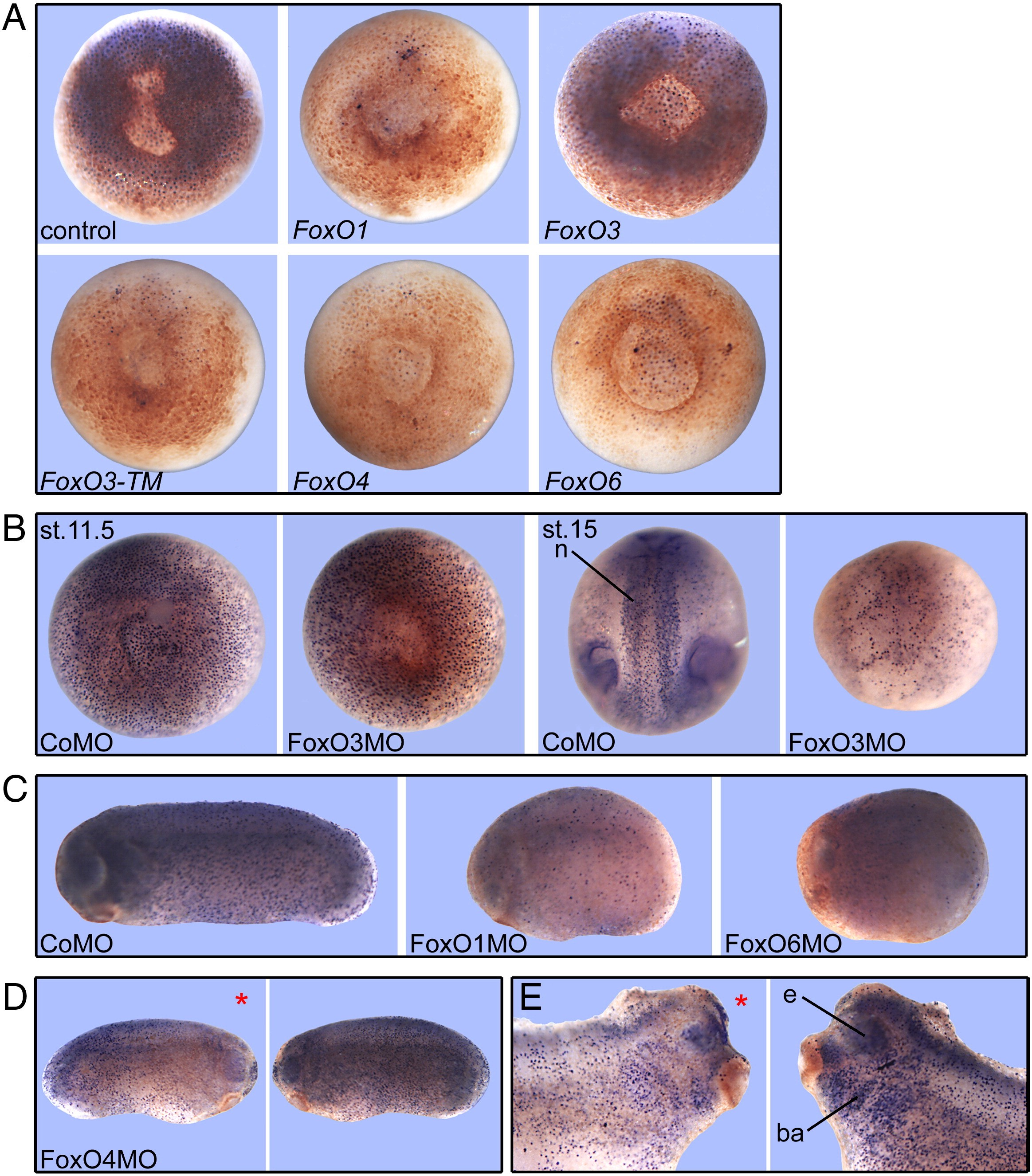Fig. 7. BrdU incorporation demonstrates reduced cell proliferation following FoxO overexpression and depletion. (A) Animal view of control embryo, stage 9.5. GOF embryos were bilaterally injected at 2-cell stage with 500 pg/blastomere FoxO1 or FoxO3, 250 pg/blastomere FoxO3-TM, 400 pg/blastomere FoxO4 and 200 pg/blastomere FoxO6 RNA. (B) Bilaterally CoMO and FoxO3MO injected embryos at stage 11.5 (animal view) and stage 15 (dorsal view). (C) CoMO, FoxO1MO and FoxO6MO injected embryo at stage 28 (lateral view). (D) Unilaterally FoxO4MO injected embryo at stage 27. (E) Magnification of the head of an unilaterally FoxO4MO injected embryo at stage 30 (lateral view). Morpholinos were uni- or bilaterally injected at indicated amounts into 2-cell stage embryos. Note that the blue spots represent BrdU positive cells, while the brown color is due to natural pigmentation of embryos. Asterisks indicate the morpholino injected side. ba, branchial arches; e, eye; n, neural fold. |