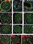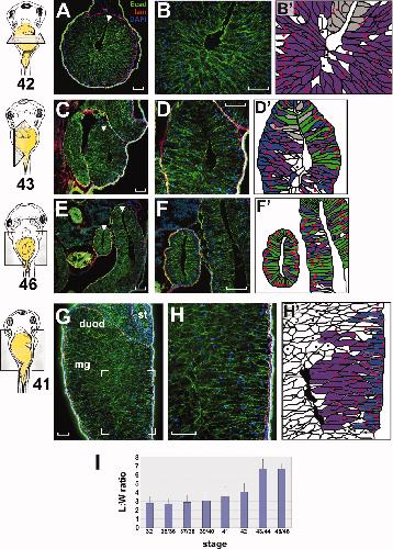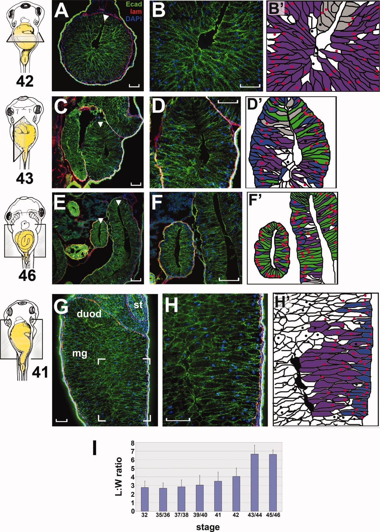 Figure 2. Changes in endoderm architecture during elongation and epithelial morphogenesis in the Xenopus primitive gut tube. Tadpoles were sectioned and immunohistochemically stained to reveal cell membranes (E-cadherin, green), the basement membrane (laminin, red), and nuclei (DAPI [4 prime ,6-diamidine-2-phenylidole-dihydrochloride], blue). The plane of section is indicated in the yellow embryo diagrams [adapted from Nieuwkoop and Faber ([1994])]. Low magnification (00; A,C,E,G) and high magnification (00; B,D,F,H) views of each section are shown. Scale bar = 100 mu M. Brackets in G indicate the region shown in higher magnification in H. The position of the gut lumen is indicated by white arrowheads. Color coding and circles in B prime , D prime , F prime and H prime highlights representative endoderm cells as in Figure 1. A-B prime : As the gut lumen begins to expand (stage 42), all endoderm cells are radially oriented and the tissue architecture is stratified columnar, with cells arranged in four to five concentric layers. C-D prime : At stage 43-44, radial intercalation has decreased the thickness and number of cell layers in the gut wall, so that only two to three layers of cells line the PGT. Some cells (green cells in D prime ) span the gut wall from the lumen to the basement membrane. E-F prime : By stage 46, epithelial morphogenesis is almost complete; a single-layered, pseudostratified epithelium now lines the narrowed gut tube. G-H prime : Endoderm cells are also interdigitated with anterior and posterior neighbors within the gut walls (stage 41 shown). I: The average ratio of endoderm cell length to width (L:W ratio) is shown for successive stages 32-46, with standard deviations indicated by error bars. duod, duodenum; mg, midgut; st, stomach. |