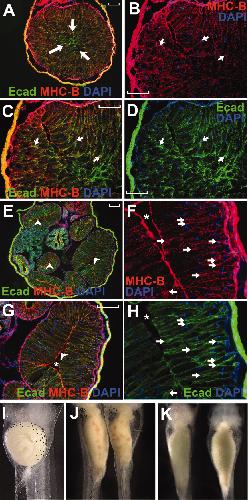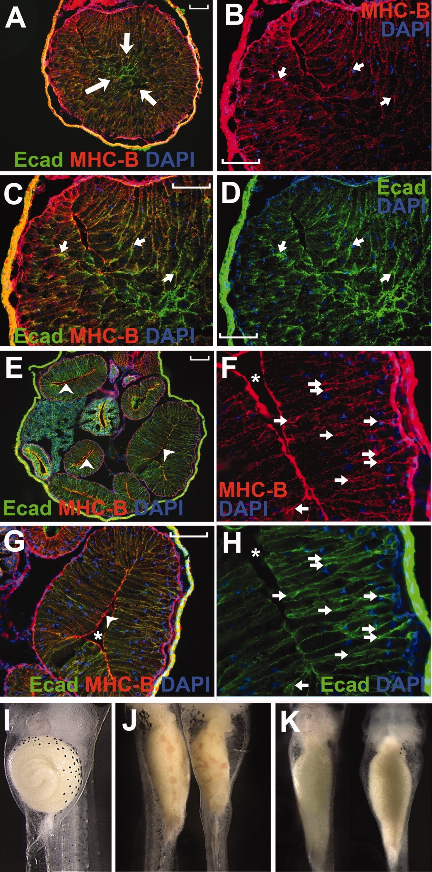 Figure 6. Myosin II is expressed in the developing gut tube and is required for gut elongation. A-H: Immunohistochemical staining for Myosin heavy chain IIB (MHC-B, red; A-C,E-G) and E-cadherin (Ecad, green; A,C,D,E,G,H) in transverse sections through the midgut (stage 40-41, A-D; stage 45, E-H) shows that MHC-B is expressed in the endoderm during gut morphogenesis. Before gut elongation, MHC-B is down-regulated in the central core of the gut tube (arrows, A), and is enriched at cell membranes (B), where it colocalizes with E-cadherin (D), particularly at the junctions between intercalating cells (arrows, B-D). After lumen (*) formation, MHC-B becomes enriched at the apical membrane (arrowheads in E) of the developing epithelium (G), and remains colocalized with E-cadherin at the junctions between intercalating cells (arrows, F,H). A,E, 00; B-D,G, 00; F,H, 00. I,J: Compared with dimethyl sulfoxide (DMSO) controls (I), chronic (J; stage 32-46) or limited (K; stage 41-44) exposure to Blebbistatin, a small molecule inhibitor of Myosin II activity, induces severe gut tube elongation defects. |