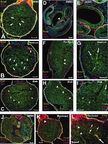 Figure 7. Rho-associated kinase and Myosin II are required for endoderm cell shape change, gut lumen formation and epithelial morphogenesis. Immunohistochemical staining for E-cadherin (Ecad, green) and laminin (lam, red) as shown in A-I, or E-cadherin (green) and Myosin heavy chain IIB (MHC-B, red) as shown in J-L, was performed on transverse (A-C; stage 41) or frontal (D-I; stage 46) sections through the midgut. Embryos were treated with dimethyl sulfoxide (DMSO; A,D,E,J), a Rho kinase inhibitor (Rockout; B,F,G,K,L), or a Myosin II inhibitor (Blebbistatin; C,H,I) from stage 32. The elongation, radial orientation, and polarization of the endoderm cells occurs normally in control, DMSO-treated embryos (arrows, A). However, in embryos exposed to Rockout or Blebbistatin, endoderm cells are more rounded and not polarized (arrows, B,C). At later stages, Rho kinase-deficient (F,G) or Myosin II-inhibited (H,I) embryos exhibit a thickened gut wall and disorganized epithelial tissue architecture in their shortened gut tubes. The gut lumen (arrowheads, D,F,H) does not expand when Rho kinase (F) or Myosin II (H) activity is inhibited. Moreover, accumulations of E-cadherin can be observed between the layers of unintercalated cells (long arrows, G,I), and centered among cells with abnormal polarity forming rosette-like clusters in the gut wall (short arrows, G,I). Finally, compared with control embryos (J), MHC-B colocalizes abnormally with E-cadherin in the disorganized epithelium of Rho kinase-deficient embryos (K,L). Scale bar = 100 mu M. |
