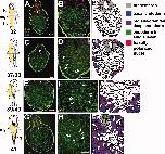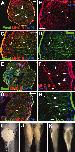 Figure 1. Changes in endoderm cell shape and polarity precede elongation in the Xenopus primitive gut tube. Tadpoles were sectioned and immunohistochemically stained to reveal cell membranes (E-cadherin, green), the basement membrane (laminin, red), and nuclei (DAPI [4 prime ,6-diamidine-2-phenylidole-dihydrochloride], blue). The plane of section is indicated in the yellow embryo diagrams (adapted from Nieuwkoop and Faber, [1994]), with stage 32-40 in lateral view and stage 41 in ventral view. Low magnification (00; A,C,E,G) and high magnification (00; B,D,F,H) views of each section are shown. Scale bar = 100 mu M. Brackets in E indicate the region shown in higher magnification in F. The position of the archenteron is indicated by white arrowheads. The color-coded legend refers to the diagrams in B prime , D prime , F prime , H prime that highlight representative endoderm cells with nuclei indicated by circles. A-B prime : Before gut tube elongation (stage 32), most of the endoderm cells are rounded and unpolarized. C-D prime : At stage 37/38, the most basal endoderm cells (arrows, D; blue cells in D prime ) adopt a radial orientation and a polarized morphology. E-F prime : At stage 39-40, deeper endoderm cells (arrows, F; purple cells in F prime ) become polarized and radially oriented. G-H prime : At stage 41, more central endoderm cells are polarized and radially oriented (arrows, H; purple cells in H prime ). fg, foregut; hg, hindgut; mg, midgut. |