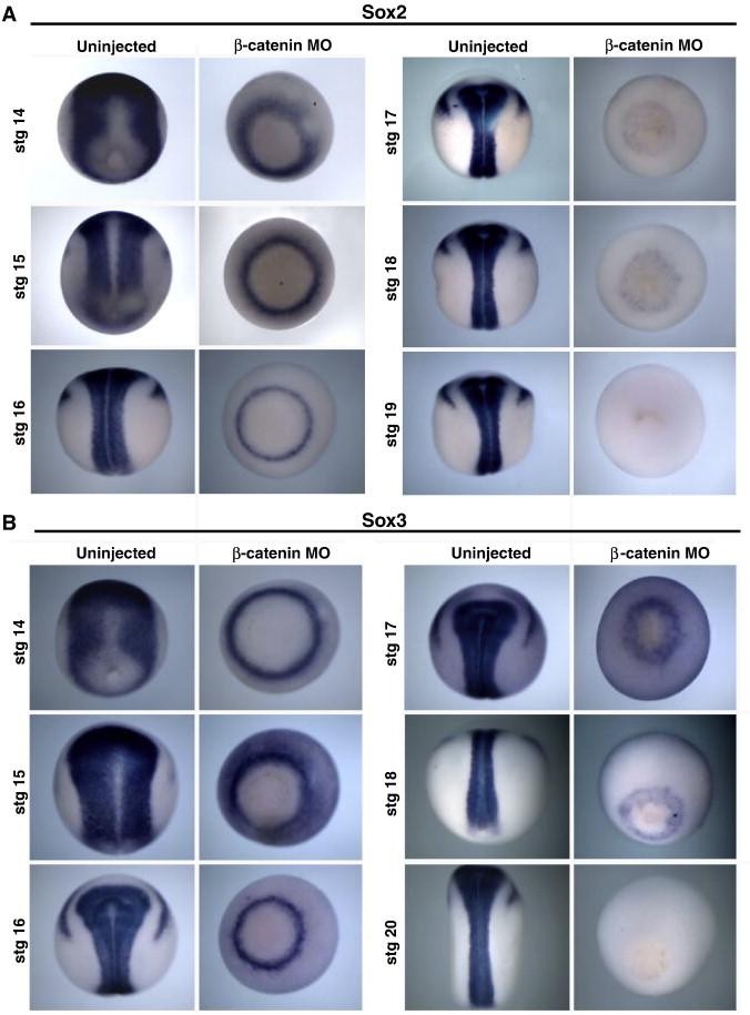 Fig. 1. Ventralized embryos express residual sox2 and sox3. X. laevis embryos were injected in both blastomeres at the two cell stage with β-catenin MO, then raised to the stage indicated, fixed in MEMFA, dehydrated and stained by in situ hybridization for expression of sox2 (A) or sox3 (B). Uninjected control sibling embryos are shown at right for each stage. For β-catenin morphants, a ring of sox2 expression is evident around the blastopore between stages 14 and 16, which fades and has disappeared by stage 19. The same pattern is seen for sox3. Embryos are shown in dorsal views with anterior to the top. |