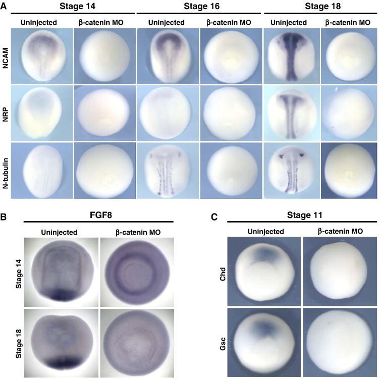 Fig. 2. Ventralized embryos do not express markers of differentiated neural tissue. X. laevis embryos were injected in both blastomeres at the two cell stage with β-catenin MO, then raised to the stages indicated, fixed in MEMFA and analyzed by in situ hybridization for expression of differentiated neural markers, the organizer markers chordin and gsc, or fgf8. Uninjected control sibling embryos are shown to the left. (A) ncam, nrp1 and n-tubulin are not expressed in β-catenin morphants. Among stage 14 β-catenin morphants, expression was observed in 0/10 embryos for ncam, 0/10 embryos for nrp, and 0/9 embryos for n-tubulin. At stage 16, expression was observed in 1/12 embryos for ncam, 0/10 embryos for nrp, and 0/10 embryos for n-tubulin. At stage 18, expression was observed in 0/32 embryos for ncam, 0/31 embryos for nrp, and 1/34 embryos for n-tubulin. The two embryos expressing detectable ncam or n-tubulin had morphologically normal neural plates, suggesting that they received a low dose of β-catenin MO. (B) fgf8 is expressed in a ring around the blastopore in β-catenin morphants at stage 14, in a pattern similar to that seen for sox2. This expression fades by stage 18. (C) Gastrula-stage β-catenin morphants do not express the organizer markers chordin or gsc (For chordin, 0/8 morphants showed expression, and 0/9 morphants expressed gsc) Embryos in A and B are shown in dorsal views with anterior to the top, while embryos in C are shown in vegetal views with dorsal to the top. |