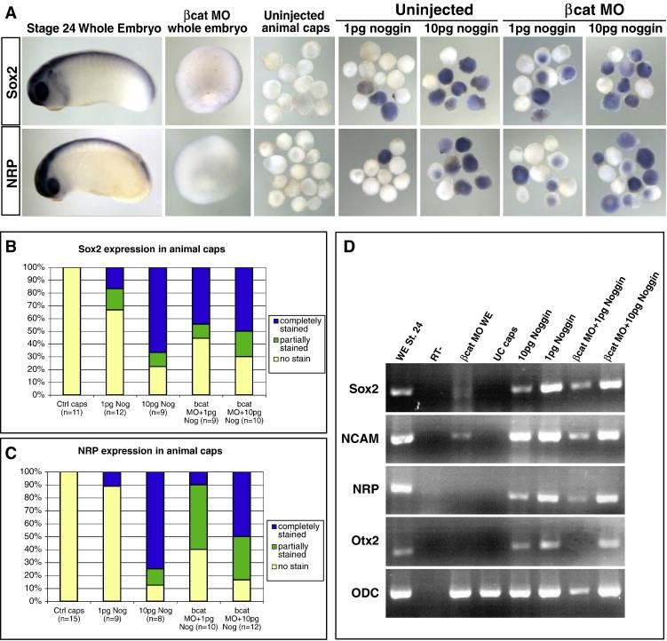 Fig. 8. Ectodermal explants derived from ventralized embryos are neuralized by Noggin. (A) X. laevis embryos were injected in both blastomeres at the two cell stage with β-catenin MO, then re-injected in the animal pole at the 4 cell stage with 1 or 10 pg of noggin mRNA. At stage 9, animal caps were cut, and cultured to stage 24. Animal caps from β-catenin morphants and control embryos injected with noggin mRNA were analyzed by in situ hybridization for expression of sox2 and nrp1. Animal caps cut from β-catenin noggin injected morphants were equally likely to express sox2 and nrp1 as caps cut from embryos injected with noggin mRNA alone. (B, C) Quantification of the results shown in (A). A repeat of the experiment gave similar results. (D) Animal caps cut from β-catenin morphants injected with noggin mRNA also strongly express both sox2 and definitive neural markers as assayed by non-quantitative RT-PCR. |