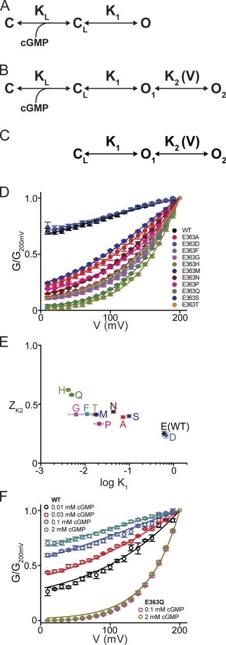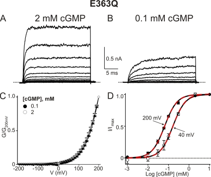 Mutations reveal voltage gating of CNGA1 channels in saturating cGMP.