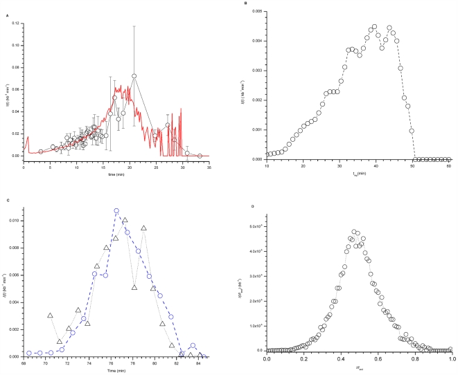Figure 1. I(t) in X. laevis, S. cerevisiae, S. pombe and D. melanogaster.A. I(t) in X. laevis. I(t) was determined from DNA combing data (open circles) as described in Materials and Methods in [26]. The data points were binned into 40 points and the dispersion in data value of each bin was determined (gray standard deviation bars). The red line is the best fit of the numerical model [26] to the data (χ2 = 0.89). The values of free parameters as described in [26] are: P0 = 1.05×10−4±1.07×10−7 kb−1 s−1, P1 = 2.1×10−3±2×10−5 kb−1 s−1, J = 5±0.5 s−1 and N0 = 1000±3. B. I(t) in S. cerevisiae was determined from the replication timing profiles of Raghuraman et al. [3] as described in the Materials and Methods. C. I(t) in S. pombe. Only the 401 strong origins defined by Heichinger et al. [4] (blue circles) and 516 potential origins defined by Eshaghi et al. [5] (black triangles) were considered. D. I(t/tend) for D. melanogaster determined from replication timing profile of chromosome 2L [28].