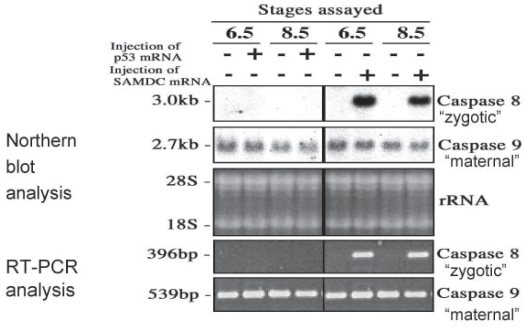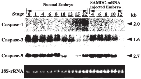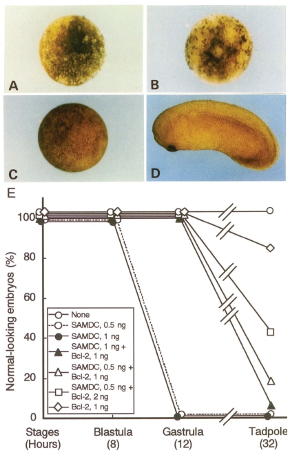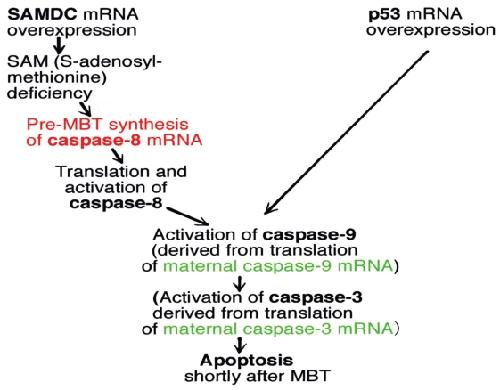 S-adenosylmethionine decarboxylase (SAMDC) is an enzyme which converts S-adenosylmethione (SAM), a methyl donor, to decarboxylated SAM (dcSAM), an aminopropyl donor for polyamine biosynthesis. In our studies on gene expression control in Xenopus early embryogenesis, we cloned the mRNA for Xenopus SAMDC, and overexpressed the enzyme by microinjecting its mRNA into Xenopus fertilized eggs. In the mRNA-injected embryos, the level of SAMDC was enormously increased, the SAM was exhausted, and protein synthesis was greatly inhibited, but cellular polyamine content did not change appreciably. SAMDC-overexpressed embryos cleaved and developed normally up to the early blastula stage, but at the midblastula stage, or the stage of midblastula transition (MBT), all the embryos were dissociated into cells, and destroyed due to execution of apoptosis. During cleavage SAMDC-overexpressed embryos transcribed caspase-8 gene, and this was followed by activation of caspase-9. When we overexpressed p53 mRNA in fertilized eggs, similar apoptosis took place at MBT, but in this case, transcription of caspase-8 did not occur, however activation of caspase-9 took place. Apoptosis induced by SAMDC-overexpression was completely suppressed by Bcl-2, whereas apoptosis induced by p53 overexpression or treatments with other toxic agents was only partially rescued. When we injected SAMDC mRNA into only one blastomere of 8- to 32-celled embryos, descendant cells of the mRNA-injected blastomere were segregated into the blastocoel and underwent apoptosis within the blastocoel, although such embryos continued to develop and became tadpoles with various extents of anomaly, reflecting the developmental fate of the eliminated cells. Thus, embryonic cells appear to check themselves at MBT and if physiologically severely-damaged cells occur, they are eliminated from the embryo by activation and execution of the maternally-inherited program of apoptosis. We assume that the apoptosis executed at MBT is a "fail-safe" mechanism of early development to save the embryo from accidental damages that take place during cleavage.