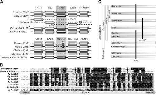Fig. 2. The evolutionary history of the Ac45 and Ac45LP genes. a Schematic overview of genes surrounding the (presumptive) Ac45LP- and Ac45 genes. The Ac45LP gene was identified in chicken and Xenopus, but not in zebrafish. In human and mouse, only a remnant of the presumptive Ac45LP gene (exon 9) was found. The Ac45LP-neighboring genes were fully conserved. The Ac45 gene and its neighboring genes were fully conserved among species, with the exception of chicken. b Alignment of the partial human and mouse presumptive Ac45LP amino acid sequences (deduced from exon 9 Ac45LP sequences) with Ac45LP amino acid sequences from various species. Asterisk Stop codon preceding the exon 9 Ac45LP open reading frame. AcAnolis carolinensi, GgGallus gallus, HsHomo sapiens, TgTaeniopygia guttata, MmMus musculus, OaOrnithorhynchus anatinus, XlXenopus laevis, XtX.tropicalis. c Lineage-dependent evolutionary fate of the Ac45 and Ac45LP genes