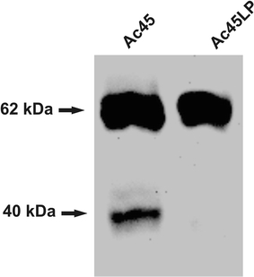 Fig. 3. Exogenous expression of Ac45 and Ac45LP in Xenopus embryos. Western blot analysis of lysates of embryos injected with synthetic Ac45 mRNA or Ac45LP mRNA. Ac45 and Ac45LP proteins were detected with an anti-Ac45-C antibody and visualized by chemoluminescence