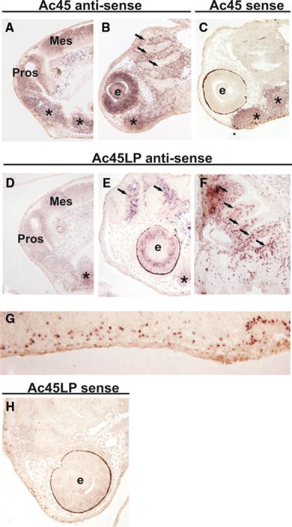 Fig. 6. Expression of Ac45 and Ac45LP mRNAs in neural tissue and neural crest cells of Xenopus embryos. Sections of developmental stage-30 Xenopus embryos hybridized with an Ac45-anti-sense probe showed Ac45 expression in the developing brain (a), in migrating neural crest cells between the pharyngeal arches and in the developing eye (b, arrows). No signals were detected with the Ac45-sense probe (c). Ac45LP mRNA expression was detected in the developing brain (d), in the migrating neural crest cells (e, f, arrows) and to a lower extent in the developing eye (e). Ac45LP mRNA-positive cells were also detected in the ventralmesoderm (g). No hybridization signal was found with the Ac45LP-sense probe (h). Asterisk Non-specific staining, e eye, Pros prosencephalon, Mes mesencephalon