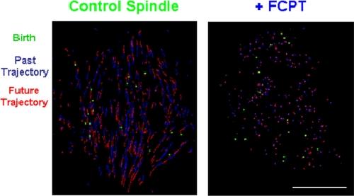 Figure 2. Trajectories of particles in spindles are illustrated by displaying the dynamics of particles located in a particular frame. A particle's future trajectory is colored red, its past trajectory is blue, and particles that were born in the selected frame are indicated by a green square. The shorter trajectories in the FCPT-treated spindle illustrate the reduced tubulin motion in this structure. Bar, 10 μm.