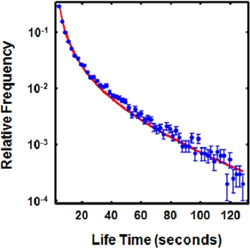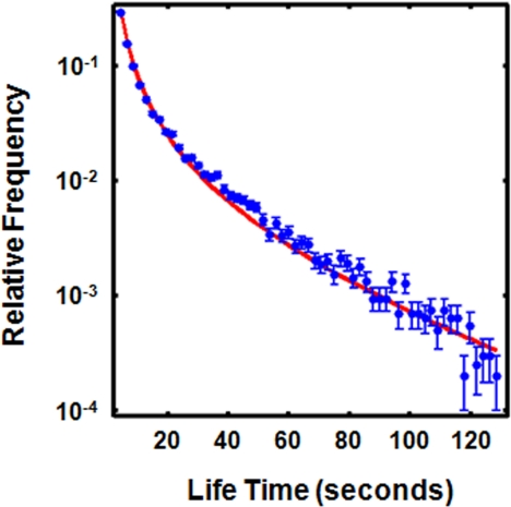 Figure 3. Distribution of tubulin lifetimes in spindles with FCPT (blue circles). A best fit to Equation 1 is included (red line, τ = 71 ± 3 s). The data and best fit were normalized to have an area of 1.