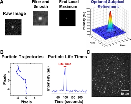 Figure 1. (A) Raw images were filtered and smoothed, and local maxima above a threshold brightness were selected as candidate particles (Crocker and Grier, 1996). For tracking displacements, the subpixel location of molecules were determined by fitting the intensity around each particle to a two-dimensional Gaussian, but the pixel location of particles was sufficient for the measurement of tubulin lifetimes and subpixel refinement was not used in that analysis. (B, left) Particle locations were linked to form trajectories by a global optimization procedure (Crocker and Grier, 1996). (B, right) Individual particles appeared and disappeared in a step-like manner. A particle's lifetime is defined as the difference between the times of disappearance and appearance. (C) Raw image of a spindle with single molecule level labeling.