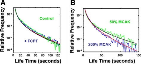 Figure 4. (A)Tubulin lifetimes are the same in unperturbed spindles (control, green symbols) and when microtubule translocation is blocked with FCPT (+FCPT, blue symbols). Best fits to Equation 1 are displayed without FCPT (black line, τ = 64 ± 6 s) and with FCPT (red line, τ = 71 ± 3 s). (B) Increasing concentration of MCAK, a microtubule depolymerizer, results in decreasing tubulin lifetimes. Spindles were assembled in extract with MCAK reduced to 50% native levels (green symbols and black line best fit to Equation 1, τ = 97 ± 11 s) or 200% native levels (blue symbols and red best fit, τ = 47 ± 8 s).