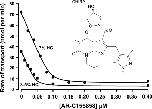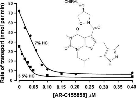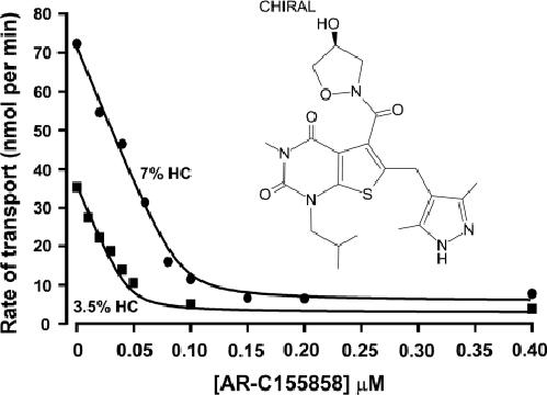 Figure 1. Inhibition of L-lactate uptake into rat erythrocytes by AR-C155858Rat erythrocytes were freshly isolated and resuspended at the specified haematocrit as outlined in the Experimental section. Cells were pre-incubated for 1 h at room temperature in the presence or absence of the specified concentration of AR-C155858 (structure shown). Transport was measured by continuous monitoring of the extracellular pH, and calibration of pH changes in terms of proton uptake was achieved by addition of standardized NaOH (10 μM final) just before addition of 10 mM L-lactate to initiate transport. Initial rates of transport were calculated by first-order regression analysis of the time course of pH change. The data were then fitted by non-linear least squares inhibition to the equation for a tight-binding non-competitive inhibitor using inhibitor concentration and haematocrit as the two x-variables [41,42]. The derived values (±S.E. of the fit shown) for the Ki and concentration of binding sites were 2.3±1.4 nM and 1.29±0.09 nmol per ml of packed cells respectively.