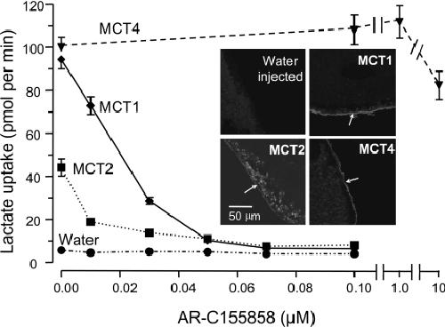 Figure 3. When expressed in Xenopus oocytes, MCT1 and MCT2, but not MCT4, are sensitive to inhibition by AR-C155858Xenopus oocytes were injected with appropriate cRNA or water and after 72 h expression they were incubated with the concentration of AR-C155858 shown for 45 min prior to measurement of L-[14C]lactate uptake over 2.5 min. Data are shown as the means±S.E.M. of 15–40 separate oocytes for each inhibitor concentration. The inset images show the expression of the relevant MCT in oocyte sections revealed using immunoflourescence microscopy with C-terminal antibodies against the relevant MCT. Arrows indicate the location of the plasma membrane. Note that for MCT2 a significant proportion of the MCT remains in an intracellular compartment.