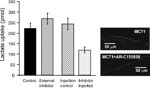 Figure 4. Microinjection of AR-C155858 inhibits MCT1 expressed in Xenopus oocytesMCT1 was expressed in Xenopus oocytes for 72 h prior to inhibitor treatment and assay of L-[14C]lactate uptake over 2.5 min. For addition of AR-C155858 internally, 20 oocytes were individually injected with 9.2 nl of 1 mM AR-C155858 or DMSO as a control, incubated for 5 min in 5 ml of pH 6 transport buffer and washed once prior to transport assay. For incubation with the equivalent amount of AR-C155858 added externally, 20 aliquots (9.2 nl) of 1 mM AR-C155858 were added to 5 ml of pH 6 transport buffer (final concentration of 35 nM) and incubated with the oocytes for 5 min prior to a single wash and transport assay as above. Uptake was corrected for the uptake by water-injected eggs under the same conditions and are presented as means±S.E.M. of 18–20 separate oocytes. The two images on the right-hand side show the plasma membrane expression of MCT1 in control oocytes and those incubated for 1 h with 1 μM AR-C155858 revealed by immunofluorescence microscopy.