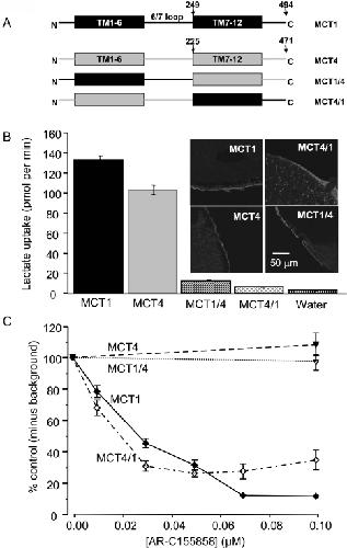 Figure 5. The binding site of MCT1 for AR-C155858 resides within the C-terminal half of the transporter(A) Shows a schematic of the MCT1/4 and MCT4/1 chimaeras used, with MCT1 sequence being shown in black and MCT4 sequence in grey. The numbered arrows indicate the position that the switch was made between MCT1 and MCT4. Native and chimaeric MCTs were expressed in oocytes for 72 h prior to incubation with AR-C155858 after which assay of L-[14C]lactate uptake was determined as described in Figures 2 and 3. Note that different times of uptake were employed depending on the activity of the chimaera as detailed in Supplementary Table S2 (at http://www.BiochemJ.org/bj/425/bj4250523add.htm). (B) Data on the absolute rate of transport of each chimaera in the absence of inhibitor. (C) The activity at each inhibitor concentration expressed as a percentage of the uninhibited rate, after the background uptake rate of water-injected oocytes was subtracted. Data are shown as the means±S.E.M. of 20–50 separate oocytes for each condition. The inset images of (B) show the plasma membrane expression of each native and chimaeric MCT revealed by immunofluorescence microscopy.