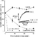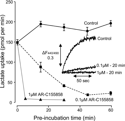 Figure 2. MCT1 expressed in Xenopus oocytes is inhibited by AR-C155858 in a time- and concentration-dependent mannerXenopus oocytes were injected with the appropriate cRNA and after 72 h expression were pre-incubated in pH 6 oocyte transport buffer in the presence or absence of 0.1 μM or 1 μM AR-C155858 for the times shown. The uptake of 0.5 mM L-[14C]lactate uptake was then determined after 2.5 min over which period it was found to be linear with time. Data are shown as means±S.E.M of ten separate oocytes. The inset shows the uptake of 20 mM L-lactate measured at pH 6.0 using the pH-sensitive dye BCECF. Data are presented for the same oocyte in the absence of inhibitor and then after 20 min superfusion with 0.1 μM and 1 μM AR-C155858.