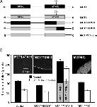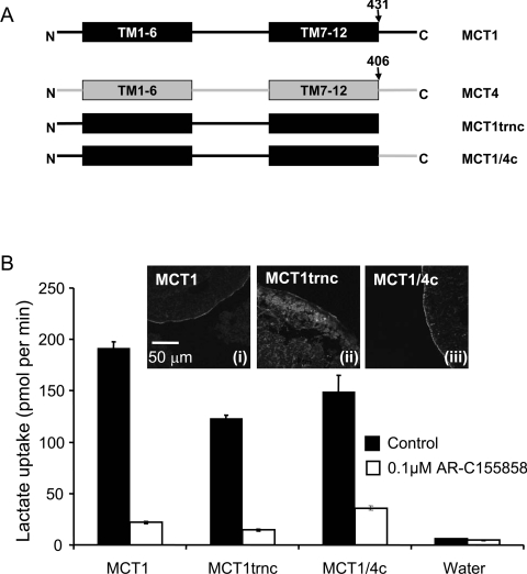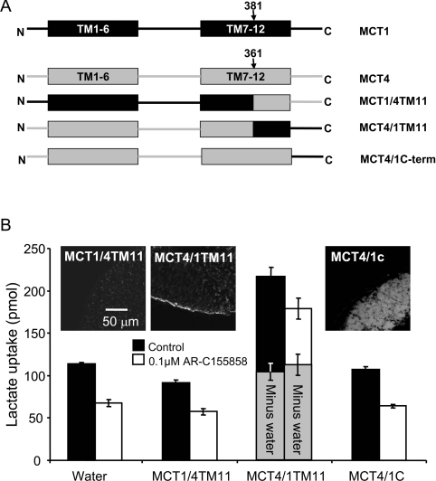 Figure 6. The C-terminus of MCT1 is not involved in AR-C155858 sensitivity(A) Shows a schematic of the MCT1/4 and MCT4/1 chimaeras used, with MCT1 sequence being shown in black and MCT4 sequence in grey. The numbered arrows indicate the position that the switch was made between MCT1 and MCT4. Native and chimaeric MCTs were expressed in oocytes for 72 h prior to incubation with or without 0.1 μM AR-C155858 for 45 min, after which assay of L-[14C]lactate uptake was determined over 2.5 min as described in Figures 2 and 3. (B) Provides mean data (±S.E.M. for ten oocytes) on the absolute rate of transport of each chimaera in the absence and presence of inhibitor. The inset images show the plasma membrane expression of each native and chimaeric MCT revealed by immunofluorescence microscopy.