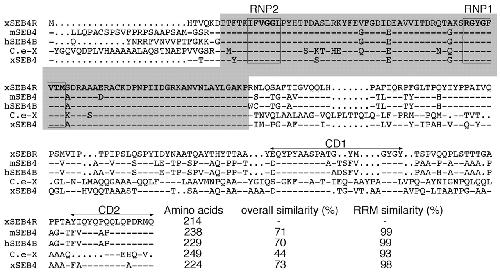 XSEB4R is an RRM-type protein. Alignment of XSEB4R (Accession Number AY289193) with its homologues in mouse (mSEB4, Accession Number NP062420), human (hSEB4B, Accession Number CAA53064) and C. elegans (C. e-X, Accession Number T33034), and with the Xenopus muscle specific XSEB4 protein (Accession Number AF223427). Dashes represent identical amino acids; dots represent gaps. The RNA recognition motif (RRM) is shaded in grey and the characteristic RNP consensus motifs (RNP1 and RNP2) are boxed. Two additional conserved domains (CD1 and CD2) are indicated. Sequence comparison is indicated as percentage (%) of amino acid similarity. |