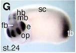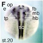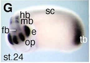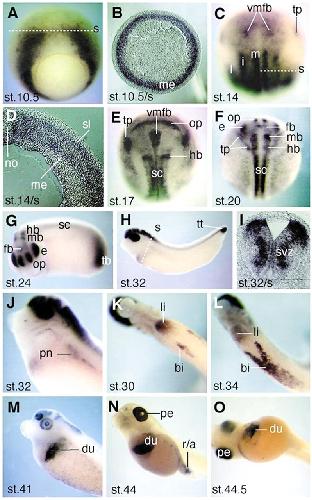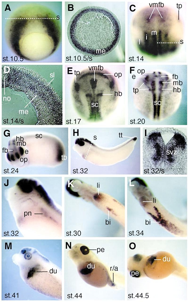 Fig. 2. XSeb4R is strongly expressed in the developing central nervous system. (A) Embryo (stage 10.5) presented in a posterior view, with dorsal up, shows a ring-like expression around the blastopore. (B) Transverse section (as indicated in A) showing Xseb4R in the mesoderm (me). (C) Embryo (stage 14) presented dorsally, with anterior up, revealing three bilateral stripes, medial (m), intermediate (i) and lateral (l), of Xseb4R expression in the open neural plate, as well as expression in the trigeminal placode (tp) and in the presumptive ventral midbrain/forebrain (vmfb) area. (D) Transverse section (as indicated in C) showing Xseb4R signals in both the sensorial layer (sl) of the neuro-ectoderm and in the mesoderm (me) as well as the notochord (no). (E,F) Embryos (stage 17 and 20, respectively) presented dorsally, with anterior up, showing additional Xseb4R expression in the olfactory placode (op), eye (e), forebrain (fb), midbrain (mb), hindbrain (hb) and spinal cord (sc). (G,H) Embryos (stage 24 and 32, respectively) placed laterally with anterior left showing Xseb4R expression in the tail bud (tb) and tail tip (tt). (I) Transverse section (as indicated in H) showing Xseb4R signal in the subventricular zone (svz) of the neural tube. (J) Lateral view showing a weak expression of Xseb4R expression in the developing pronephros (pn). (K) Two bilateral stripes of Xseb4R expression in cells associated with blood islands (bi), and a strong signal in the liver (li). (L) Expression during the characteristic Y-shape formation of blood islands. (M) Xseb4R-expressing cells in the area associated with duodenum (du) formation. (N,O) Embryos presented in the ventral view showing pigmented eye (pe) and Xseb4R expression in the presumptive rectum/anus (r/a). |