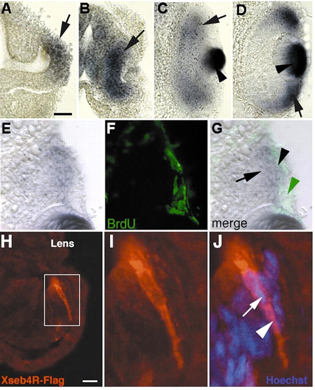 Fig. 3. In the retina, Xseb4R is expressed in retinoblasts and undifferentiated postmitotic neurons. (A-D) In situ hybridisation showing the spatio-temporal expression pattern of Xseb4R on retinal sections at various developmental stages. (A) At stage 28, Xseb4R is expressed in the whole presumptive neural retina that contains dividing retinoblasts (arrow). (B) At stage 32, Xseb4R is expressed in the whole neural retina containing mainly dividing precursor cells (arrow). (C) At stage 34, Xseb4R is most strongly expressed in the lens (arrowhead) and in the peripheral region of the neural retina containing dividing precursors (arrow). (D) At stage 37, Xseb4R expression is restricted to the CMZ (arrow) and the lens (arrowhead). (E-G) Staining for BrdU uptake (green; F) and Xseb4R expression (blue; E) at stage 39. Double staining (G) shows that BrdU-positive cells in the peripheral CMZ are Xseb4R negative (green arrowhead). In the central CMZ, BrdU-positive cells also express Xseb4R (black arrowhead). Some cells are BrdU negative and stained with Xseb4R (arrow). Scale bar in A: 50 μm. (H-J) Retinoblasts of stage 34 embryos were transfected at stage 18 with Xseb4R-Flag DNA. On sections, immunostaining was performed with an anti-FLAG antibody revealing the presence of XSEB4R-FLAG (red; H). (I) Higher magnification of this retinoblast. Hoescht staining was performed to visualise the nucleus. (J) Double staining showing that XSEB4R-FLAG is mainly cytoplasmic. The nucleus (arrow) and cytoplasm (arrowhead) are indicated. Scale bar in H: 30 μm. |