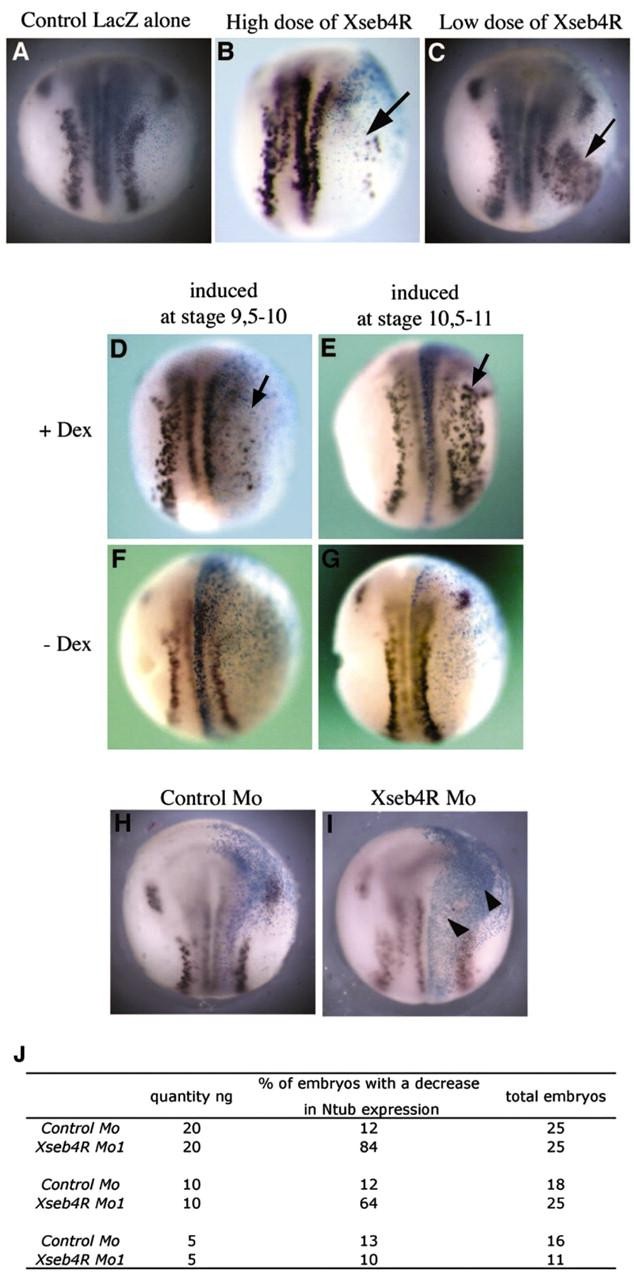 Fig. 6. Xseb4R is involved in the regulation of primary neurogenesis in Xenopus embryos (A-C) Dorsal views of embryos injected with control lacZ mRNA (A), 200 pg of Xseb4R mRNA plus lacZ mRNA (B), or 50 pg of Xseb4R mRNA plus lacZ mRNA (C), and stained for N-tubulin expression (dark blue). β-galactosidase activity is shown in light blue. Whereas the high dose (200 pg) of Xseb4R represses N-tubulin expression on the injected side (arrow in B), the low dose (50 pg) leads to the expansion of the N-tubulin domain (arrow in C). (DG) Dorsal views of embryos after injection of the fusion construct Xseb4R-GR. Induction with dexamethasone was performed between stage 9.5 and 10 (D), or between stage 10.5 and 11 (E). F and G show non-induced control embryos. Whereas induction of Xseb4RGR between stage 9.5 and 10 represses N-tubulin expression in the injected side (arrow in D), induction of Xseb4R-GR between stage 10.5 and 11 leads to expansion of the N-tubulin domain (arrow in E). (H,I) Dorsal views of embryos after injection of control Mo (H) or Xseb4R Mo1 (I). Xseb4R Mo1 leads to a repression of N-tubulin expression in the injected side (arrowheads in I). (J) Effects of various doses of control Mo and Xseb4R Mo1 on N-tubulin expression. Injections of 10 or 20 ng of Xseb4R Mo1 lead to a decrease of N-tubulin expression compared with control embryos. |