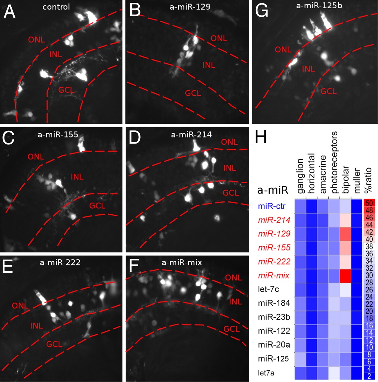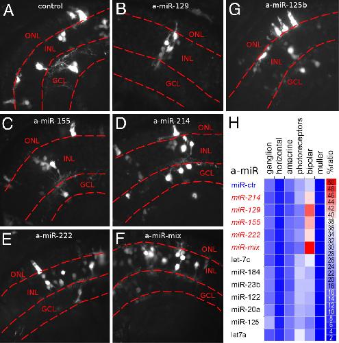 Fig. 3. In vivo inactivation of miR-129, miR-155, miR-214, and miR-222 supports the bipolar cell fate. (AâG) Sections of retinas, lipofected with control (A) or antisense to miRNAs (a-miRNAs, BâG) oligonucleotides, show morphology of lipofected cells (GFP positive, white detection) in the differentiated cell layers: outer nuclear layer (ONL), inner nuclear layer (INL), and ganglion cell layer (GCL). Bipolar cells are located in the INL. a-miR-mix is an equimolar mix of antago-miRNAs to mir-129, miR-155, miR-214, and miR-222. (H) Heat map shows the percentage ratio (red to blue) of neuronal (ganglion, horizontal, amacrine, photoreceptor, and bipolar) and glial (Müller) cells in retinas lipofected with antisense oligonucleotides to miRNAs (a-miR) as reported in Table S3. |