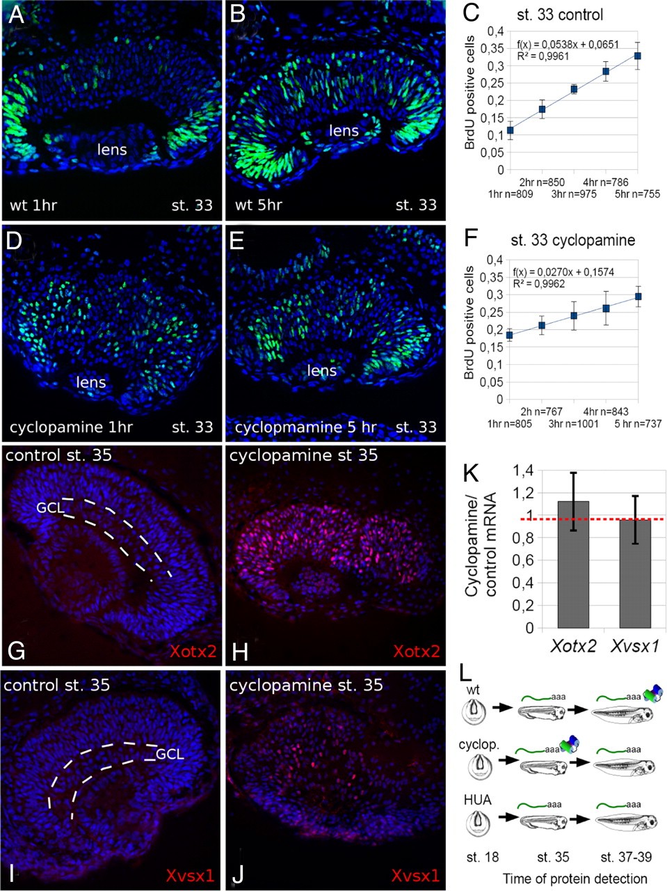 Fig. 1. hh inactivation lengthens the cell cycle and anticipates Xvsx1 and Xotx2 translation in early retina progenitor cells. (AâF) BrdU cumulative analysis of st. 33 retina. (A, B, D, and E) BrdU (green) and nuclei (Hoechst, blue) detection on retina sections. The slope of the line in CâF indicates the rate of the cell division cycles (see Materials and Methods). (n) number of scored cells. (GâJ) Xotx2 and Xvsx1 immunodetection (red) and nuclear detection (Hoechst, blue) on st. 35 retina. GCL indicates ganglion cell layer, which is detectable in control retinas (G and I) but not in cyclopamine-treated retinas (H and J). (K) Cyclopamine/control relative ratio of Xvsx1 or Xotx2 mRNA as detected by qRT-PCR in st. 35 dissected retinas. Red dashed line marks ratio = 1, bars show SE. (L) Xotx2 and Xvsx1 developmental expression of mRNA (âaaa) and protein (colored item) in WT, cyclopamine-treated, and HUA-treated retinas. |