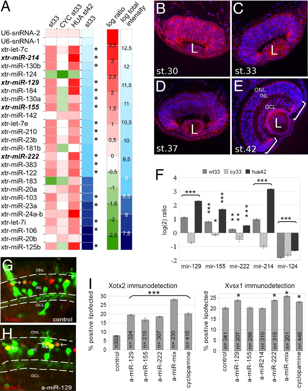 Fig. 2. Four developmentally regulated miRNAs inhibit the translation of Xotx2 and Xvsx1. (A) Heat map shows log ratios (red to green) of miRNA expression from WT and treated retinas with respect to WT st. 42 retina (baseline), after normalization with U6 snRNA1â2. The 25 miRNAs giving the highest hybridization signal (log total intensity, white to blue) in the st. 33 array are shown. (BâE) ISH detection (red) of mir-129; nuclei are stained by Hoechst (blue). (F) Relative quantification of miRNAs at st. 33 (wt33, WT; cy33, cyclopamine-treated) and at st. 42 after HUA treatment (hua42) as compared with their expression levels in st. 42 WT retinas (baseline). Error bars show SEM. (G and H) Xotx2 immunodetection (red) of lipofected cells (green, GFP detection). Arrows indicate double-positive cells. (I) Proportion of either Xvsx1- or Xotx2-positive lipofected cells. a-miR, antisense oligonucleotide to the indicated miRNA; a-miR-mix, equimolar mixture of antisense oligonucleotides to miR-129, miR-155, and miR-222 (Xotx2 immunodetection) or to miR-129 and miR-222 (Xvsx1 immunodetection). (n) number of cells analyzed. Error bars show SE. (L) lens; ONL, outer nuclear layer; INL, inner nuclear layer; GCL, ganglion cell layer. *, P < 0.05; **, P < 0.01; ***, P < 0.001 (Student's t test). |