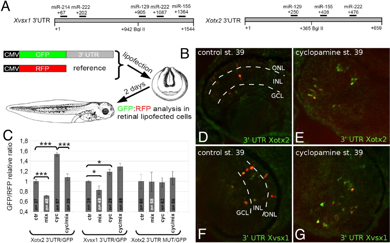 Fig. 4. mir-129, mir-155, mir-214, and mir-222 target the 3â² UTR of Xotx2 and Xvsx1. (A) miRNA target sites as evaluated by functional assay in HEK 293 cells (Figs. S5 and S6). (B) In vivo sensor assay. (C) In vivo translational efficiency of GFP sensors as in B. Bars indicate GPF/RFP relative intensity ratio after lipofection. Cyc, cyclopamine. Mix, an equimolar mixture of antisense oligonucleotides to mir-129, miR-155, and miR-222 (for Xotx2 3â² UTR), or to mir-129, miR-155, miR-214, and miR-222 (for Xvsx1 3â² UTR). (n) number of retinal sections. Error bars show SE. Asterisks as in Fig. 2. (DâG) Examples of cells colipofected with sensors and control antisense oligonucleotide. ONL, outer nuclear layer; INL, inner nuclear layer; GCL, ganglion cell layer. Layers did not form properly in cyclopamine-treated retinas (E and G), as previously described (20). |