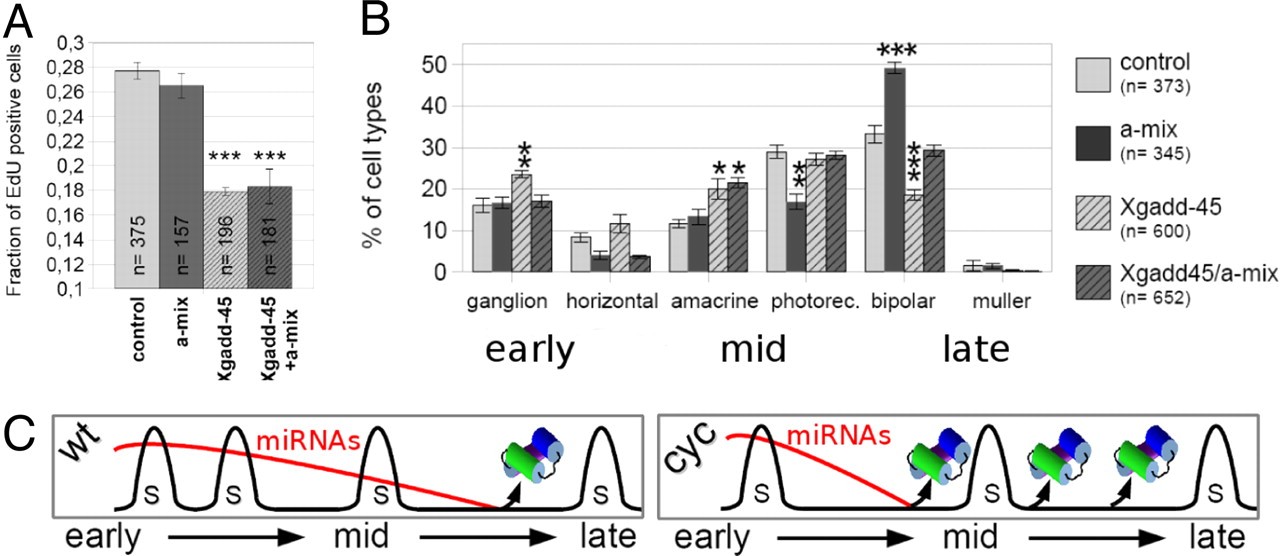 Fig. 5. miR-129, miR-155, miR-214, and miR-222 act downstream of the cell cycle setting a bipolar cell fate. (A) Fraction of EdU-positive lipofected cells. Error bars indicate SE. (n) number of cells. (B) Proportion of different lipofected retinal cell types. Error bars indicate SEM. Asterisks as in Fig. 2. (C) Model representing regulation of the timing of the translational inhibition of Xotx2 and Xvsx1 by mir-129, miR-155, miR-214, and miR-222 (miRNAs). S is the synthesis phase of the progenitor cell cycle. Early, mid, and late refer to cell birthdates in B and to retinal developmental stages in C. |