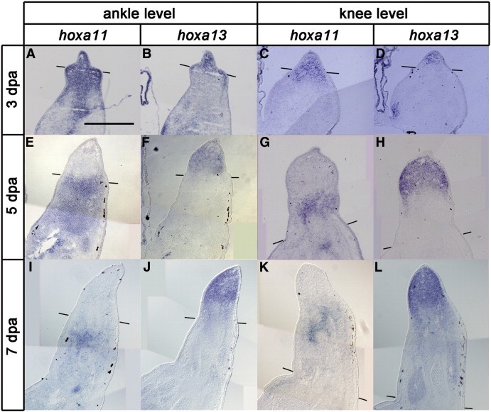 Fig. 2. hoxa11 and hoxa13 expressions in tadpole blastemas. Blastemas were derived from amputations at the ankle level (A, B, E, F, I and J) or at the knee level (C, D, G, H, K and L). (A, C) hoxa11 expression in 3 days post amputation (dpa) blastema. (B, D) hoxa13 expression in 3 dpa blastema. (E, G) hoxa11 expression in 5 dpa blastema. (F, H) hoxa13 expression in 5 dpa blastema. (I, K) hoxa11 expression in 7 dpa blastema. (J, L) hoxa13 expression in 7 dpa blastema. Note that expression patterns of hoxa11 and hoxa13 during tadpolelimb regeneration were similar to those of a developing limb bud (Fig. 1). Lines indicate the estimated amputation planes. Distal is to the top in all figures. Scale bar = 400 μm.