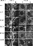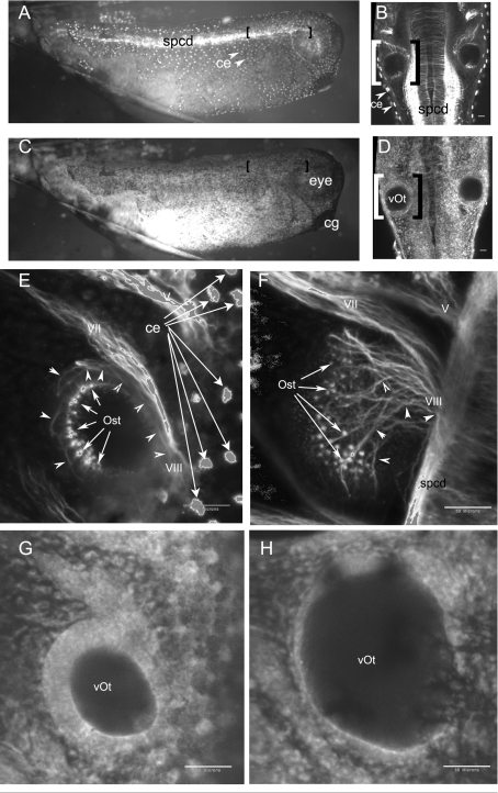 Figure 3. Detection of otic development in Xenopus embryosOtic development was monitored by fluorescence using whole mount immunohistochemistry to detect acetylated tubulin (A, B, E, F) and F-actin using phalloidin (C, D, G, H). (A–E, G) These Figures show progressively increased magnification of a stage 32 embryo, with bracketed regions indicating the region shown in the next magnification. (A, C) These Figures were visualized using a fluorescent microscope and are shown in lateral view with heads on the right. (B, D) These Figures were visualized through the dorsal–ventral plane using a confocal microscope with the anterior at the top of the images. (E–H) These Figures are confocal sections through the dorsal–lateral prospect. The anterior of the embryo is towards the top of each image. (F, H) These Figures are the otic region from a stage 40 embryo. The spcd, ciliated epithelial cells (ce), otic sensory tissue (Ost), neurites associated with otic sensory tissue (arrowheads) and cranial nerves (V, VII and VIII) are noted on panels detecting tubulin; the otic vesicle (vOt), eye and cement gland (cg) are noted on panels detecting F-actin. Scale bars in (B, D, E, F, G, H), 50 μm. |