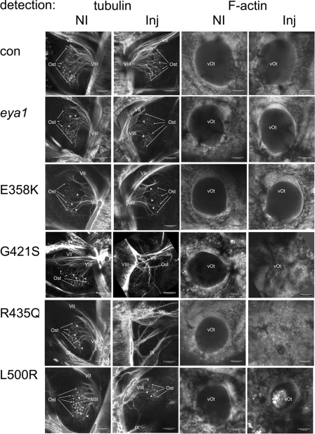 Figure 5. Stage 32 otic development is disrupted by eya1 mutants linked to BORStage 32 embryos were imaged using a confocal microscope from the dorsal–lateral prospect. The anterior of the embryo is towards the top of each image. Dual panels on the left show tubulin distribution; dual panels on the right detect F-actin. In each dual set, the non-injected side (NI) of the embryo is on the left and the injected side (Inj) is on the right. Material injected into the right side of the embryo is indicated for each row of panels. In panels detecting tubulin, the cranial nerves (VII and VIII) are labelled when visible. The label for VIII is placed as close to the attachment to the spcd as possible. Otic sensory tissue (Ost) is pointed out using arrows that help indicate the most anterior and posterior extents of this tissue type. Arrowheads indicate neurites that are associated with sensory tissue and VIII. The otic vesicle (vOt) is labelled where visible on panels showing F-actin. Scale bars, 50 μm. (Note: the right panel for non-injected controls are also shown enlarged in Figures 3E and 3G.) con, control. |