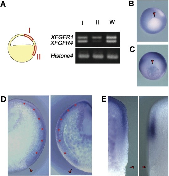 Fig. 1. Differential expression of XFGFR1 and XFGFR4 on the dorsal side of embryos. (A) RT-PCR analysis of XFGFR1 and XFGFR4 mRNAs in the prospective anterior region (I) and posterior region (II) (each 0.45 mm wide and 0.2 mm long) excised from the dorsal side of stage-10 embryos. W: whole embryos. (B,C) XFGFR1 (B) and XFGFR4 (C) expression in stage-11 embryos. Arrowheads indicate the dorsal blastopore groove. (D) A stage-11 embryo was sagitally bisected through the dorsal blastopore groove (arrowheads), and the halves were hybridized for XFGFR1 (left) or XFGFR4 (right). Dotted lines indicate the ectoderm/ mesoendoderm boundary. (E) A stage-11 embryo was sagitally bisected, and the halves were hybridized for XFGFR4 (left) or XHR1 (right). Before bisection, the dorsal side was flattened by gentle pressure to compare the distances between the posterior limits of the expression regions and the blastopore groove (arrowheads).